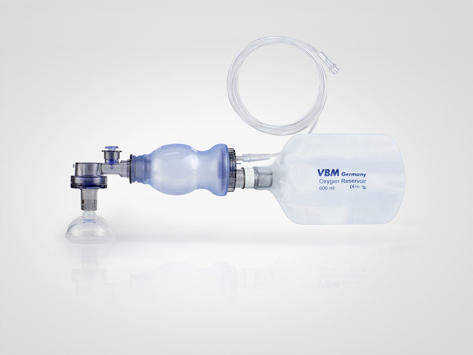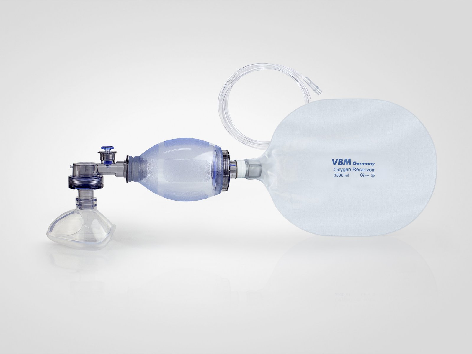 w sztywnym, przezroczystym pudełku silikonowy worek resuscytacyjny 450 ml silikonowa maska rozmiar 3 worek rezerwy poj. 2500 ml dren O2 dł. 200 cm |